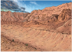 This fictional scene takes place in a hot, sandy desert wilderness landscape in Israel.