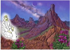 This picture simply shows the Lord God sitting on a rock, looking at the mountains, stars and the Milky Way galaxy which He has just finished creating.