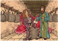 This scene shows a woman pouring new wine into an old wineskin, held by a man. I imagine they are working in a winery; the long corridor behind them has wooden pegs on the walls, upon which the wineskins are hung and stored. I have drawn the same couple I drew in the previous scene “Luke 05 – Parable of new cloth on old robe”, since these scenes are related.