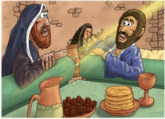 Like the previous scene, this picture is set in the home of Simon the Pharisee. In this scene we are viewing the figures and room from the stand point of the servant who has just put a plate of flat breads onto the table. The view is towards the back of the room, with Jesus on the right and Simon on the left (the reverse of the previous picture).