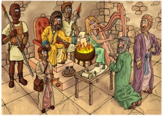 The money-lender mentioned in Jesus’ parable is the man in golden robes, sitting on a throne-like chair, in the middle of the room. Behind him are two tough-looking guards holding spears. On the left is a scribe, holding a pair of weighing scales. A lady harpist is in the background. To the right are the two men who owe money: the man in green owes five hundred denarii, the one in purple owes fifty denarii.
