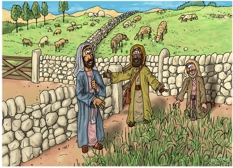 This scene occurs some months later than the previous scenes, as here the plants are growing, but aren’t yet ready to be harvested. At this stage the weeds (Lolium temulentum (aka Darnel)) look very similar to the wheat. We can see two of the farmers servants looking confused and bewildered as to where all the weeds might have come from. The farmer is just about to explain the weed seeds origin to them.