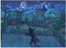 A crescent moon illuminates this scene, casting shows below the figure and objects.